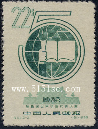 简称纪54错版票,这套邮票是为庆祝国际学联第五届代表大会在北京召开而发行的,由刘硕仁设计,图案上部是国际学联会徽与阿拉伯数字5的结合体,下部是天安门,全套2枚,面值分别为8分、55分。邮票定于1959年9月4日大会开幕之日发行,邮票票名“第五届世界学生代表大会”也是根据有关部门指示而定的。在大会开幕前几天,邮票发行局突然接到该部门通知称:这次大会名称是“国际学联第五届代表大会”而非“第五届世界学生代表大会”。邮电部发行局接到此通知后,遂决定将已印就的邮票全部撤回作废。经过邮电部门的共同努力,更名后的邮票“国际学联第五届代表大会”在9月4日大会开幕那天如期发行。但原先错票由于个别邮局提前发售,有极少量流出。在中国97’嘉德春季邮品钱币拍卖专场上,一枚未发行的22分“第五届世界学生代表大会”全新邮票以44万元成交。