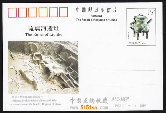 玻璃河遗址位于北京房山县大石河左岸的旧城、刘李店、董家林、黄土坡、立教、庄头等村较高的台地上。经调查钻探和发掘,发现居住地、古城墙、墓葬区等遗迹,出土大批造型奇特美观的青铜器,其中大部分铸有铭文,有的还有“郾侯”字样,证实周初燕国的封地就在北京,是目前我国所存商周遗址中较重要的一处。为配合1995年北京建城3040年纪念活动,邮电部1995年8月21日发行纪念邮资片一枚,邮资图案是琉璃河燕国墓地M1193墓葬中出土的铜甭,邮资片上的图案是1981-1983年间清理发掘得M1046的陪葬坑--1100号车马坑,内有车5辆,殉马14匹。
